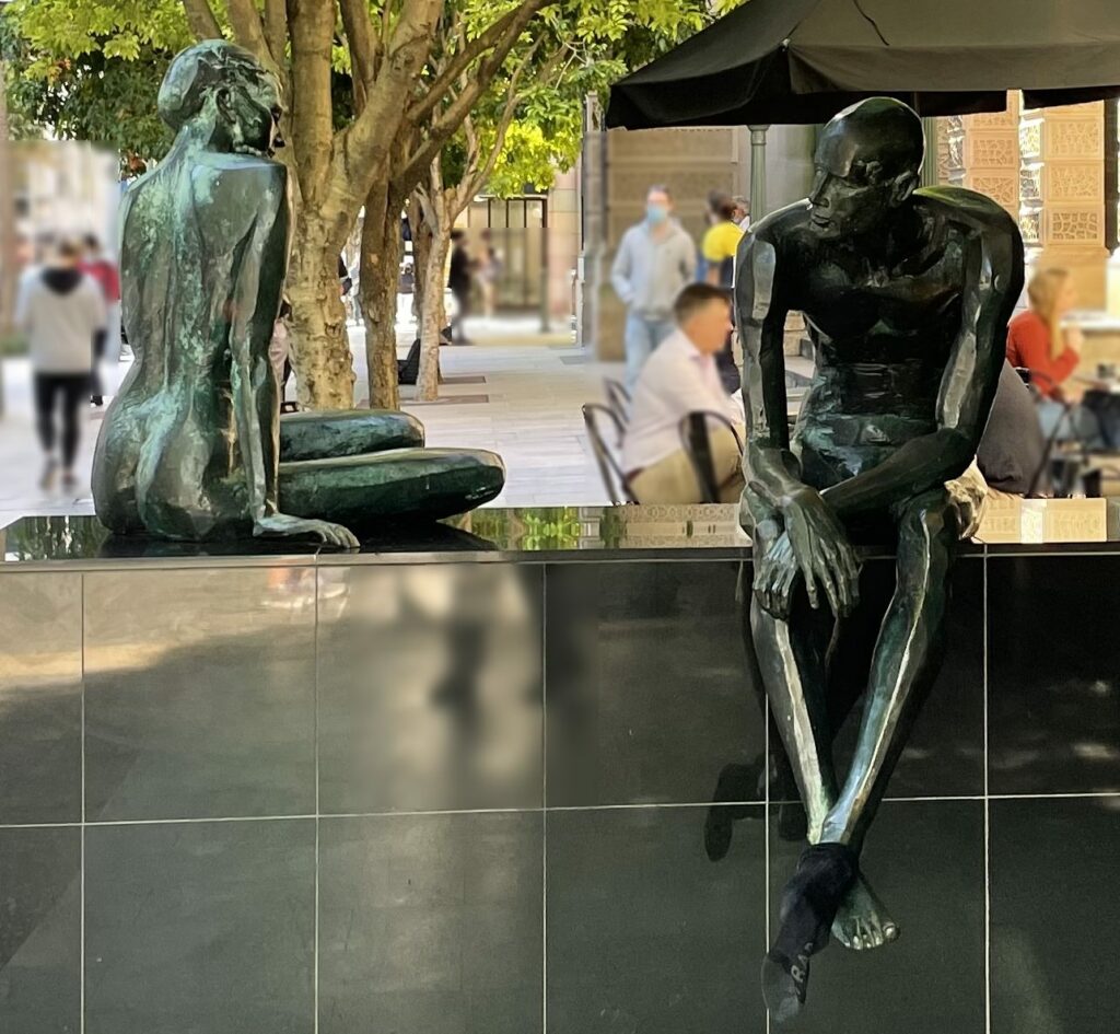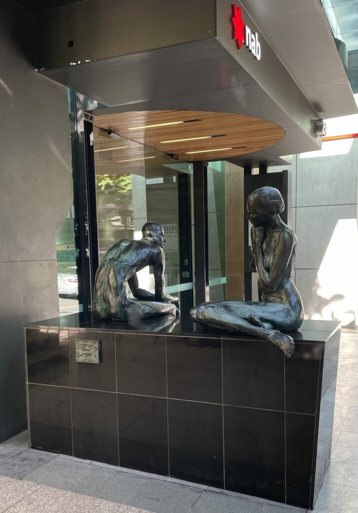 A sculpture by Cezary Stulgis called Dialogue seated on a wall on Queen Street near the MacArthur Chambers. The cast bronze figures took up their perch on the wall in 2004. They are a brilliant interpretation of the human form in an everyday situation.